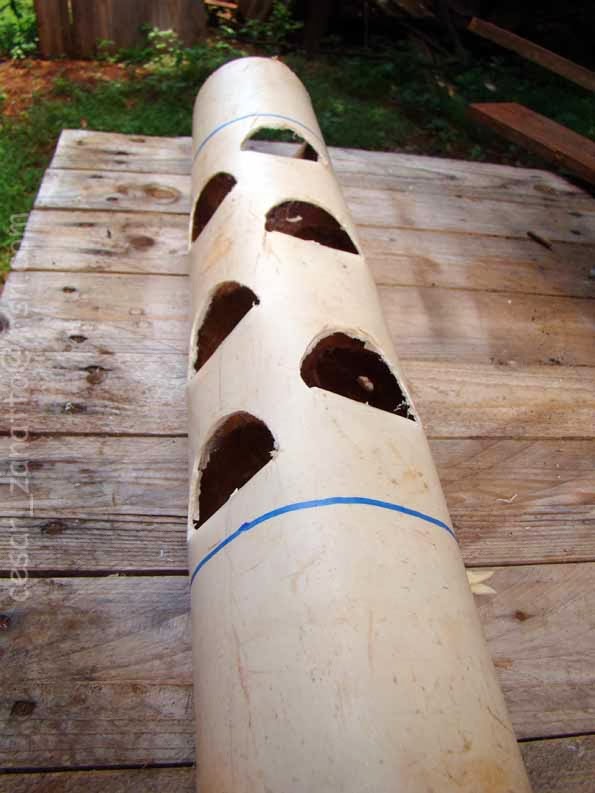 Divida o círculo do cano em 4, pegue 2 opostos e os outros dois opostos faça o buraco mais abaixo, intercalando assim os furos (penúltima foto demostra bem esse detalhe).